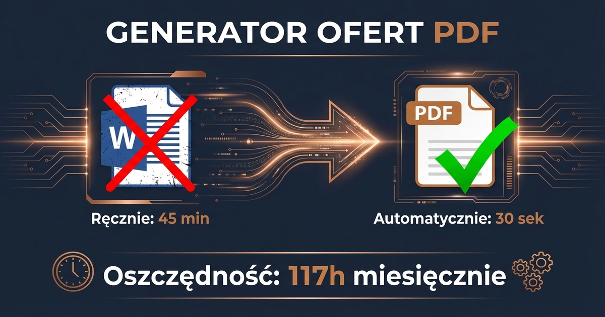 Handlowiec dostaje zapytanie. Otwiera Word. Kopiuje szablon. Wkleja dane klienta. Poprawia cenę. Eksportuje do PDF. Wysyła mailem. Czas: 45 minut. Powtarza to 8 razy dziennie. 6h dziennie na oferty. A mógłby sprzedawać. Generator ofert PDF robi to w 30 sekund — automatycznie. Dane z CRM → szablon z Twoim logo → PDF na email klienta. Zero ręcznej pracy. W tym artykule: jak działa generator ofert, jakie narzędzia wybrać, jak zbudować workflow i ile czasu odzyskasz.