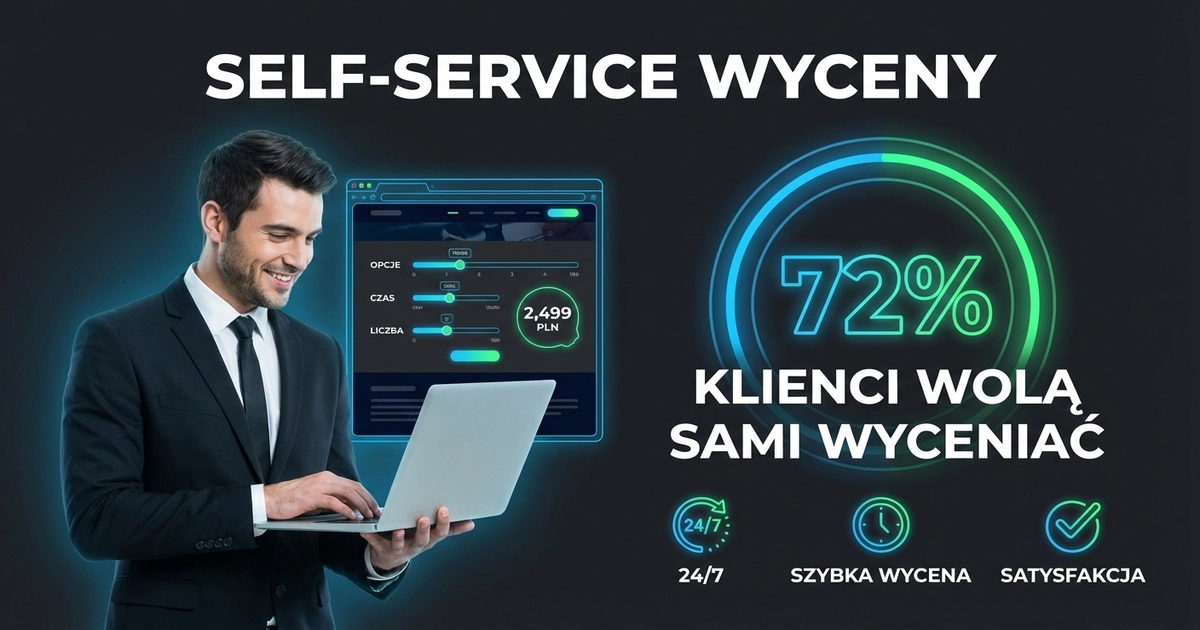 72% decydentów B2B woli samodzielnie sprawdzić cenę na stronie niż dzwonić do handlowca. Nie dlatego, że nie lubią ludzi — dlatego, że cenią swój czas. Chcą kontroli. Chcą porównać opcje w spokoju, bez presji. Chcą wiedzieć ile coś kosztuje ZANIM ktoś do nich zadzwoni. Self-service wyceny to model, w którym klient sam wycenia produkt lub usługę na Twojej stronie — a Ty dostajesz gotowego, zakwalifikowanego leada. W tym artykule: dlaczego klienci tego oczekują, co Twoja firma na tym zyskuje i jak to wdrożyć.